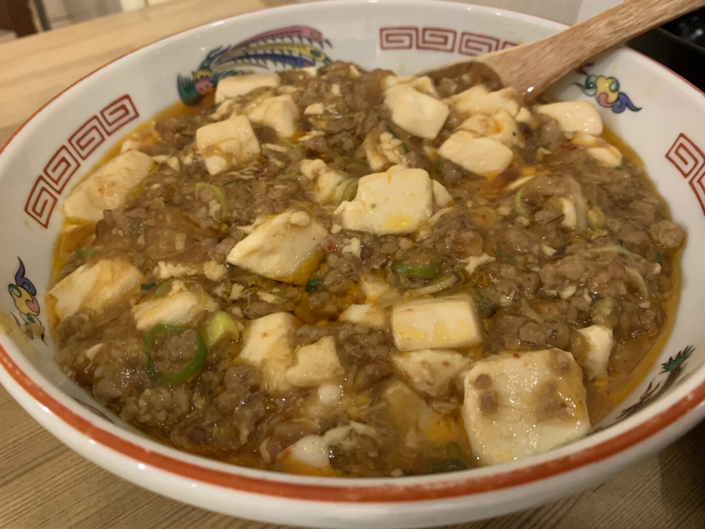 さいごにお好みでごま油を少量まわしかけたら、夫も大満足のからいからい麻婆豆腐の完成です。