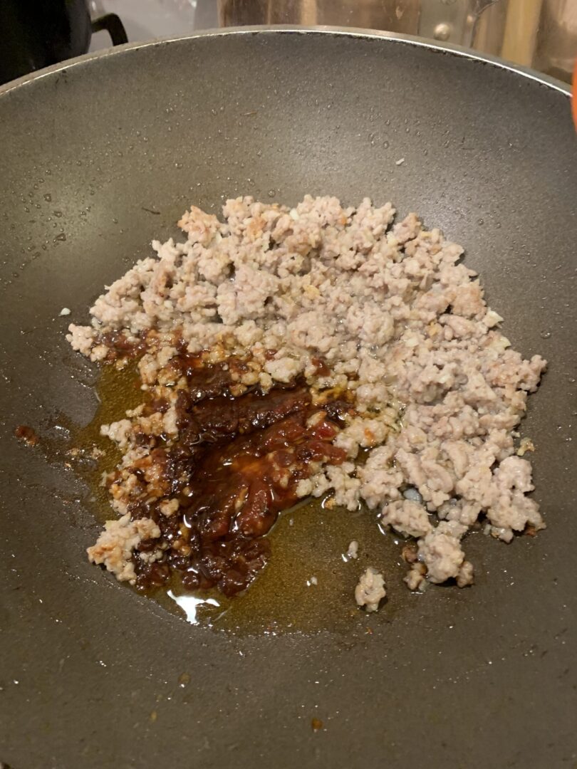 - フライパンに油ちょっといれて豚ひき肉をしっかり炒める。