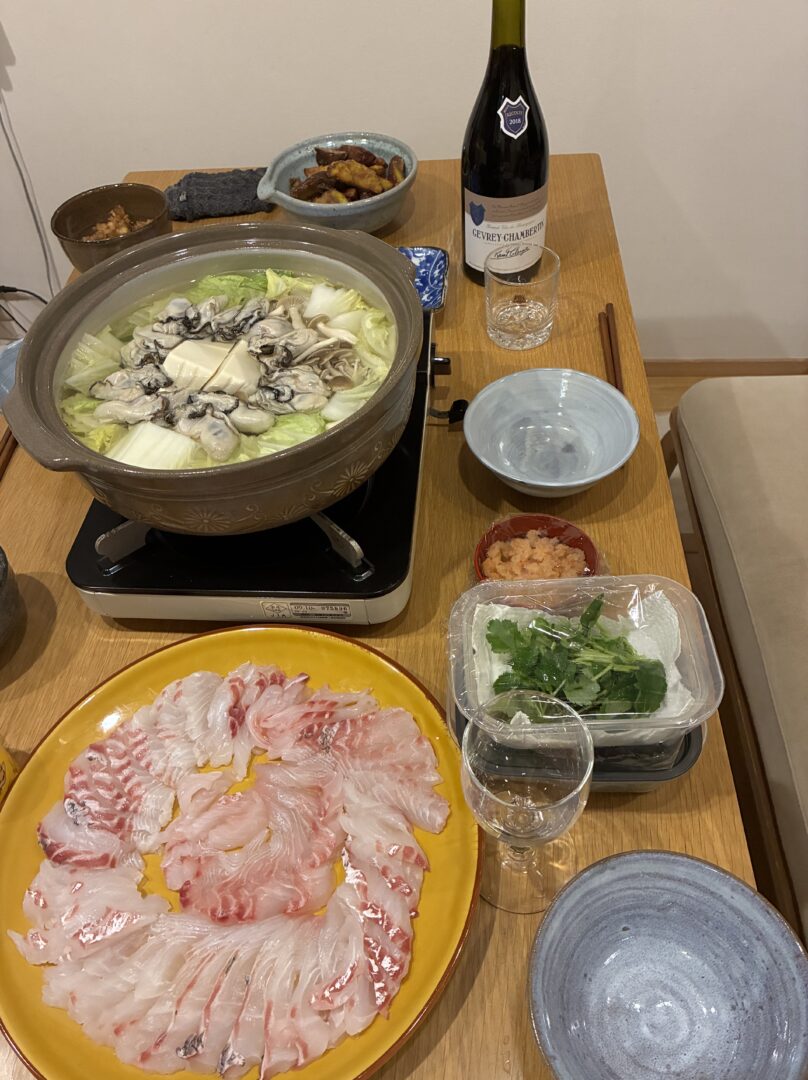 先日、釣りの先生が釣った鯛をたくさんわけてもらって帰ってきてたので、それを贅沢に鯛しゃぶに。featuring牡蠣。